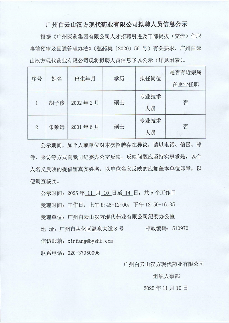 广州白云山汉方现代药业有限公司拟聘人员信息公示
