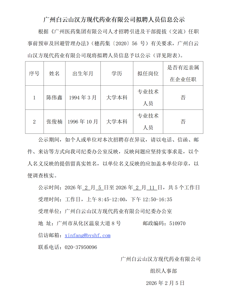 广州白云山汉方现代药业有限公司拟聘人员信息公示岗位职责