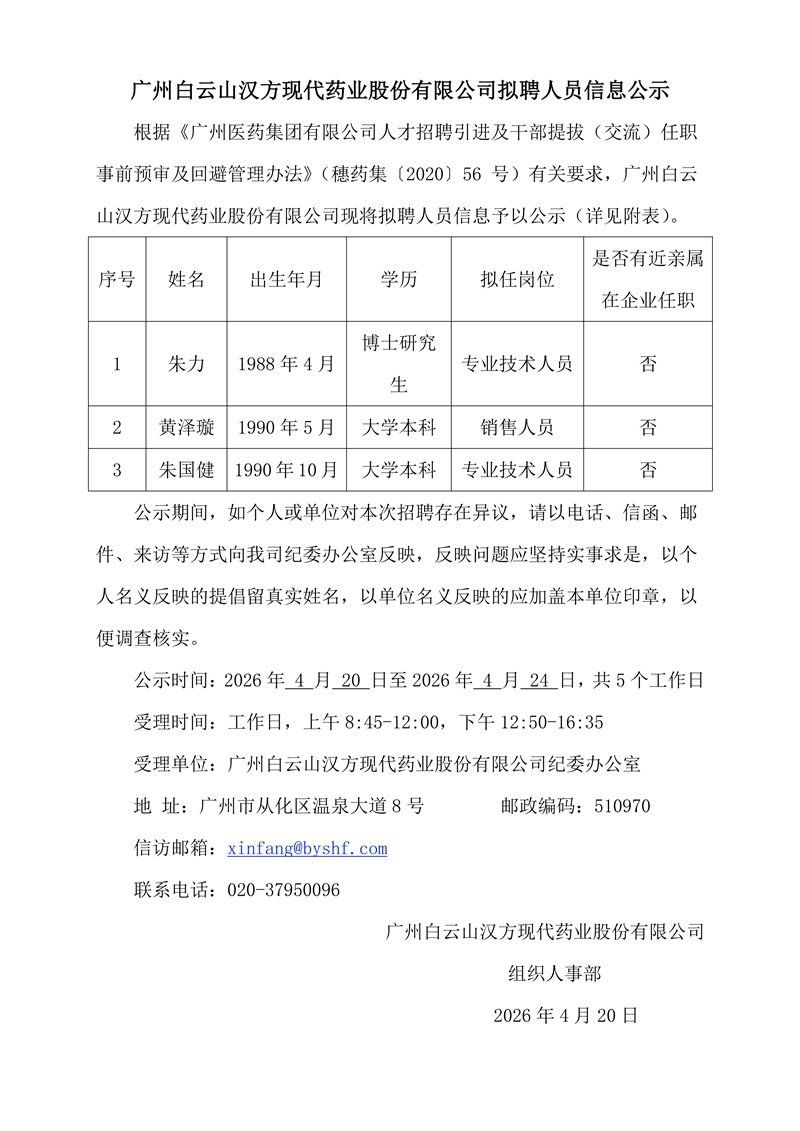 广州白云山汉方现代药业股份有限公司拟聘人员信息公示岗位职责
