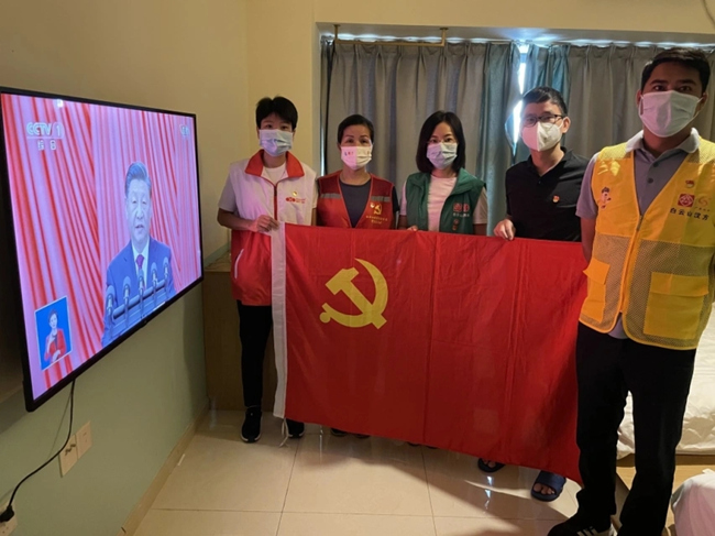 值得一提的是,广药集团第三批支援花都疫情防控突击队于10月16日上午成立了临时党支部,其中汉方突击队队长彭兴华同志担任生活委员,负责后勤保障工作,并组织汉方志愿者收听收看大会直播。几位青年志愿者从10月14日前往花都区以来,连续数日积极参与各项疫情防控工作,在工作之余不忘学习,他们用实际行动诠释了青年的担当作为,践行了坚定不移听党话、跟党走的决心。